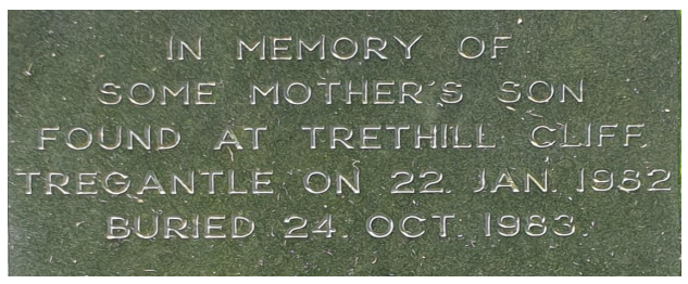 IN MEMORY OF SOME MOTHER’S SON FOUND AT TRETHILL CLIFF, TREGANTLE, ON 22. JAN. 1982, BURIED 24. OCT. 1983.