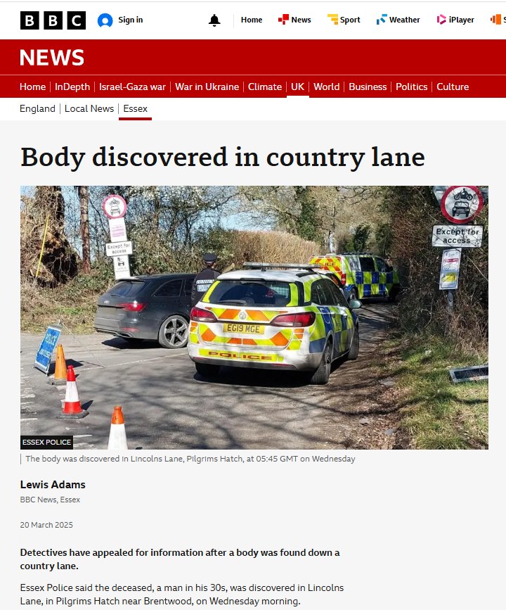 On Wednesday 19 March at approximately 5.45am, Essex Police were called to Lincolns Lane in Pilgrims Hatch, near Brentwood, where the body of a man believed to be in his 30s had been discovered. At this stage, the deceased male remained unidentified.
